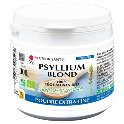 18,50 €Le Psyllium Blond Bio Spécial Cuisine de chez Vecteur Santé® est un ingrédient riche en fibres, idéal pour améliorer la texture des recettes sans gluten et favoriser la santé digestive. -