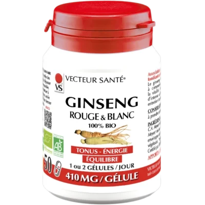20,40 €Le Ginseng Rouge et Blanc de Vecteur Santé® est un complément naturel qui associe de deux préparations de Panax ginseng issues de l’agriculture biologique, cultivées en Chine. Le Panax ginseng contribue à la vitalité et à l’énergie, aide la résistance de l’organisme face au stress temporaire et favorise le bien‑être physique et mental. Fabriqué en France. -