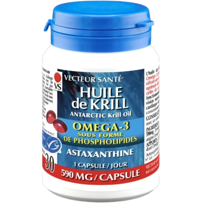 20,70 €Huile de krill (Euphausia superba) de Vecteur Santé® issue de pêche durable certifiée MSC. Chaque capsule apporte 590 mg d’huile de krill, dont 159 mg d’oméga-3 (EPA 89 mg, DHA 41 mg). Contient naturellement des phospholipides, de la choline et de l’astaxanthine (pigment rouge). Pilulier de 30 capsules. -