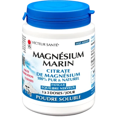 13,30 €Le magnésium marin Vecteur Santé®, en poudre soluble de citrate de magnésium issu d’eau de mer de l’Atlantique Nord, en poudre soluble à diluer dans une boisson. Le magnésium contribue à réduire la fatigue, au fonctionnement normal du système nerveux et à des fonctions psychologiques normales. -