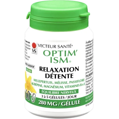 17,60 €OPTIM’ISM® RELAXATION DÉTENTE de Vecteur Santé associe millepertuis, mélisse, passiflore, aubépine, magnésium marin et vitamines B1, B3, B6, B8 et E. Les plantes favorisent la relaxation et contribuent à un sommeil sain. Le magnésium et les vitamines B1, B3, B6 et B8 contribuent au fonctionnement normal du système nerveux; la niacine (vitamine B3), la vitamine B6 et le magnésium contribuent à réduire la fatigue. Fabriqué en France. -
