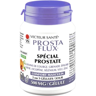 17,90 €PROSTA'FLUX® SPÉCIAL PROSTATE de Vecteur Santé® associant des extraits de graine de courge, d’épilobe, de racine d’ortie et de grenade, avec du zinc, du sélénium et de la vitamine E. Fabriqué en France. -