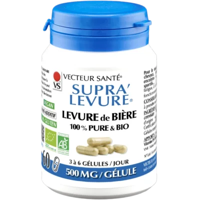 10,30 €SUPRA'LEVURE® Levure de Bière Bio Gélules de Vecteur Santé® est un complément alimentaire à base de levure de bière bio (Saccharomyces cerevisiae). Grâce à sa teneur en vitamine B9 (folates), il contribue au fonctionnement normal du système immunitaire, à la réduction de la fatigue et au maintien de fonctions psychologiques normales. Fabriqué en France. -