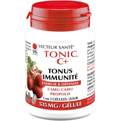 17,90 €TONIC C+® de Vecteur Santé® est une formule à base de Camu-Camu bio, naturellement riche en vitamine C, associée à la propolis. Grâce à la vitamine C, il contribue à réduire la fatigue, au fonctionnement normal du système immunitaire et à protéger les cellules contre le stress oxydatif. Fabriqué en France. -