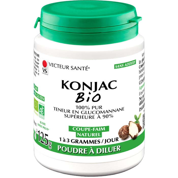 Le KONJAC 100% PUR de VECTEUR SANTÉ® est un complément alimentaire naturel contenant du glucomannane, une fibre alimentaire soluble.