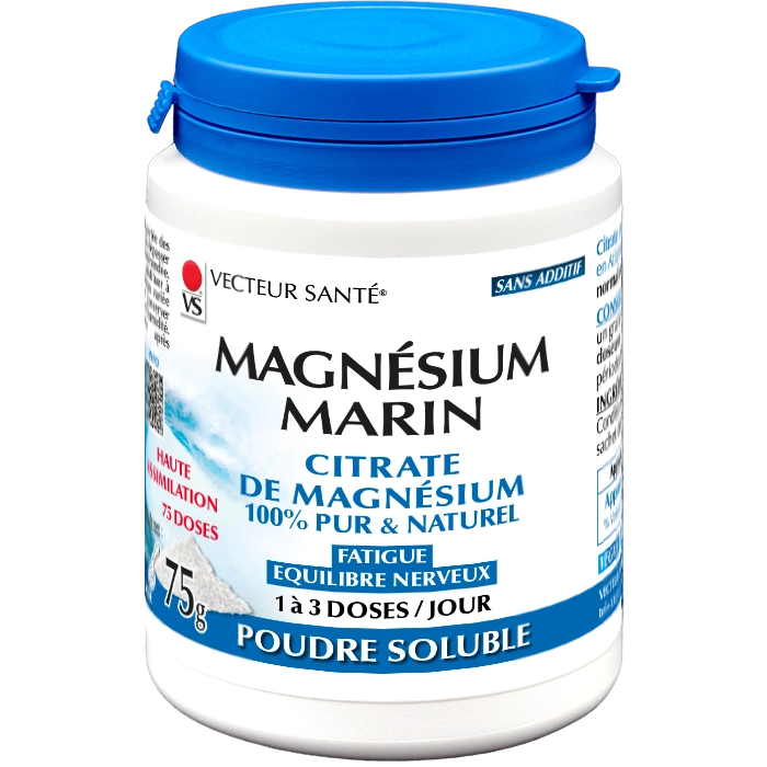 Le magnésium marin Vecteur Santé®, en poudre soluble de citrate de magnésium issu d’eau de mer de l’Atlantique Nord, en poudre soluble à diluer dans une boisson. Le magnésium contribue à réduire la fatigue, au fonctionnement normal du système nerveux et à des fonctions psychologiques normales.