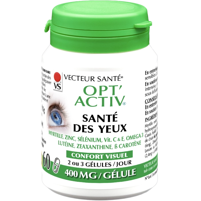 OPT’ACTIV® Santé des Yeux de Vecteur Santé® est un Complément alimentaire associant extraits végétaux, oméga-3 et nutriments. La vitamine A et le zinc contribuent au maintien d’une vision normale. Les vitamines C et E, le zinc et le sélénium contribuent à protéger les cellules contre le stress oxydatif. La vitamine C contribue également à réduire la fatigue.
