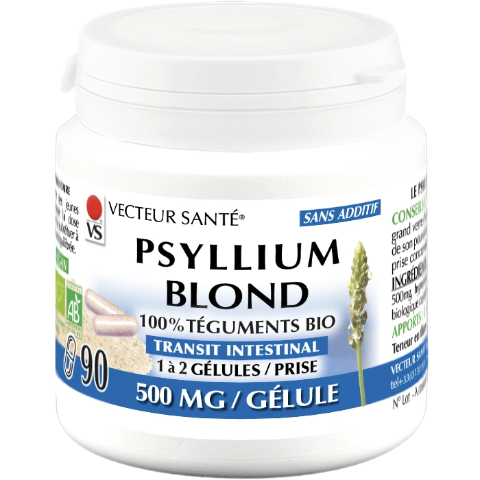 PSYLLIUM BLOND BIO GÉLULES de Vecteur Santé® – complément alimentaire à base de téguments de graines de Plantago ovata. Il est reconnu pour contribuer au transit intestinal et soutenir la fonction digestive. Fabriqué en France.