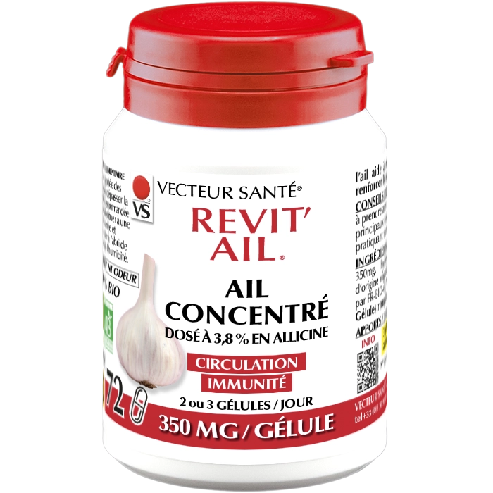 REVIT’AIL® de Vecteur Santé® est un complément à base d’ail bio, traditionnellement utilisé pour son rôle dans le maintien d’une bonne circulation sanguine et du bien-être cardiovasculaire.
